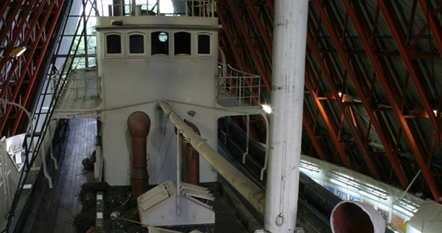この展示館には、木造のマグロ漁船「第五福竜丸」およびその付属品や関係資料を展示しています。「第五福竜丸」は、昭和29年(1954年)3月1日に太平洋のマーシャル諸島にあるビキニ環礁でアメリカが行った水爆実験によって被害を受けました。 木造漁船での近海漁業は現在も行われていますが、当時はこのような木造船で遠くの海まで魚を求めて行ったのです。 「第五福竜丸」は、昭和22年(1947年)に和歌山県で建造され、初めはカツオ漁船として活躍し、後にマグロ漁船に改造され遠洋漁業に出ていました。水爆実験での被爆後は、練習船に改造されて東京水産大学で使われていましたが、昭和42年(1967年)に廃船になったものです。 東京都は、遠洋漁業に出ていた木造漁船を実物によって知っていただくとともに、原水爆による惨事がふたたび起こらないようにという願いをこめて、この展示館を建設しました。 <東京都 昭和51年(1976)6月10日開館>